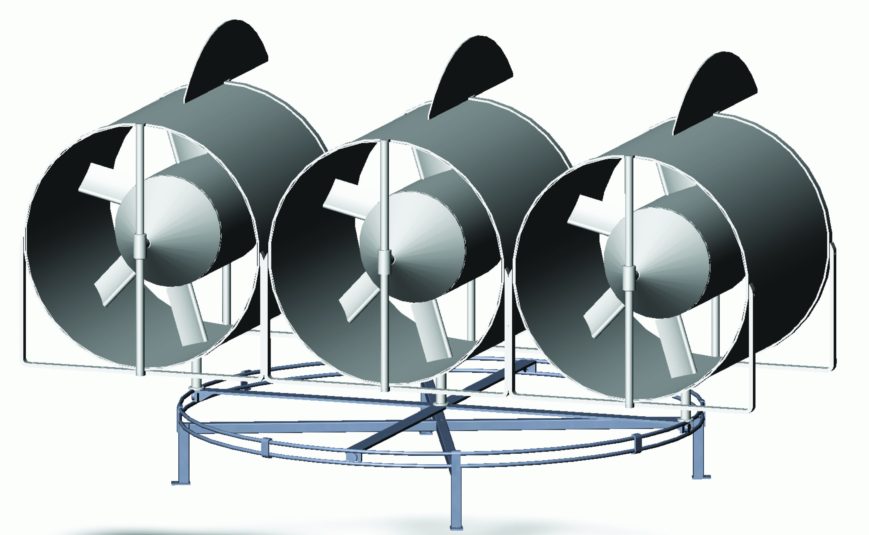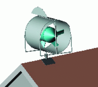 Die drei verschiedenen Aufsätze haben die Funktion, die Luftwirbel beim Abströmen aus der Turbine in die Umgebungsluft zu glätten. Turbulenzen werden so in Grenzen gehalten. Eine weitere konstruktive Variante ist die Aneinanderreihung von drei baugleichen Turbinen. Diese Anordnung kommt dann zum Tragen, wenn aus ästhetischen (optischen) Gründen eine Rotorvergrößerung auf einem Hausdach nicht infrage kommt. Die Anlage sitzt auf einem Drehgestell. Aus Kostengründen besteht auch die Möglichkeit, auf die Ummantelung komplett zu verzichten. Der Leistungswirkungsgrad des hier dargestellten Sechsblatt- rotors (ohne Ummantelung) ist im Verhältnis zum frontalangeströmten Rotor wesentlich höher. Zum Einsatz kommen die dargestellten Windturbinen auf Hausdächern.