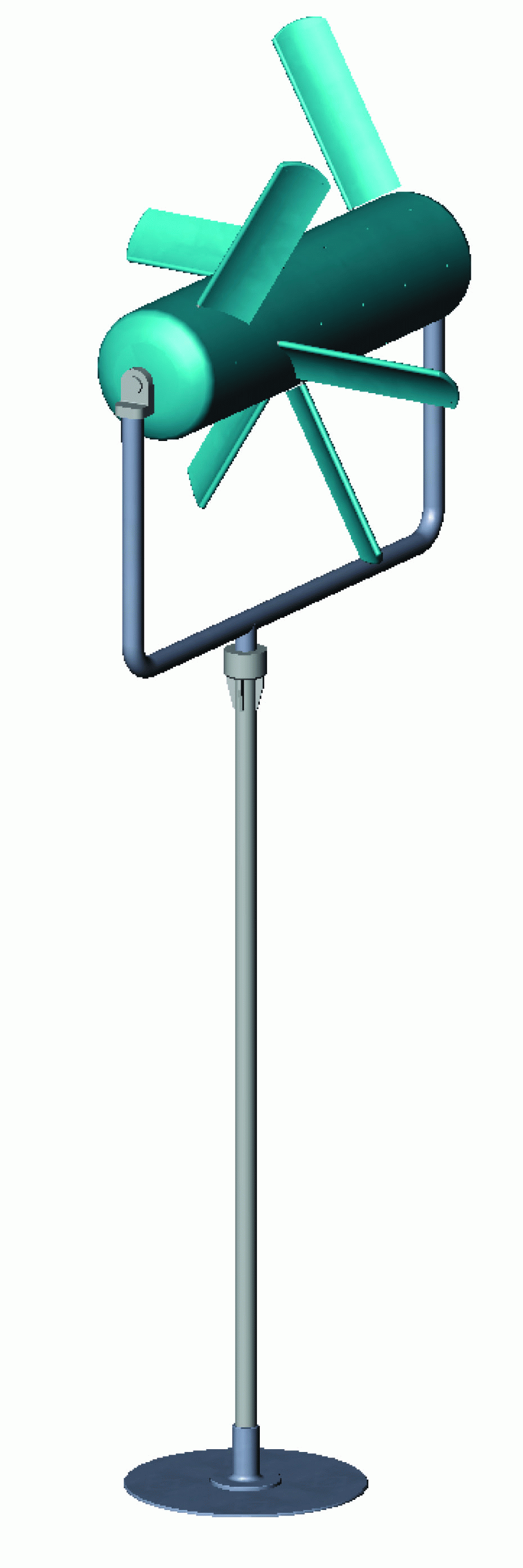 Es handelt sich hier um eine horizontale Windkraftkonstruktion, in der der sechflügelige Rotorkörper von einem aerodynamisch geformten Ringgehäuse umgeben ist. Die kreisrunde Ummantelung des Rotors hat die Funktion,Windturbulenzen zu glätten und den Strömungswirbel leistungsmäßig zu intensivieren. Erreicht wird dieses Ziel durch die aerodynamische Formgebung des Rotorkörpers und deren Ummantelung.Die Rotorkonstruktion hat die Form eines länglichen Zylinders mit strömungstechnischer Profilierung an der Vorder - und Rückseite des Körpers. Die sechs Rotorflügel sind hintereinander in einem Winkel von 60 Grad kreisrund auf der horizontal drehenden Rotorwelle versetzt angeordnet. In Verbindung mit dem Gehäuse und Rotor bildet die Turbine in ihrer Komplexität einen Durchströmungskanal. Der Luftstrom wird massiv beschleunigt. Wirksam wird der aerodynamische Vorgang dadurch, dass die sechs Rotorblätter nicht auf einer gemeinsamen Rotorebene ausgerichtet sind. Eine frontale Anströmung der Flügel wird vermieden. Erst die versetzte Flügelanordnung ermöglicht einen höheren Durchsatz der Luftmassen. Die Konsequenz ist eine deutliche leistungsintensivierung. Um eine Unwucht im Drehverhalten des Rotos zu verhindern,sind die Flügel mit Gegengewichten versehen. Die Kontergewichte erzeugen bei der Rotation eine zunehmende, dynamische Kraftreserve.Bei schwanken- den Windverhältnissen wird die Drehzahl des Rotors konstant gegehalten. Durch Veränderung der Gehäuseform kann die Leistung der Windturbine nachträglich massiv gesteigert werden. Die leistungsintensivste Windkraftkonstruktion ist eine aerodynamische Profilierung der Turbine. Sie besteht aus einem doppelten, trichterförmigen Ringgehäuse im Ein-und Aussrömbereich. Die zunehnmende Querschnittsveränderung verursacht auf der Einströmseite eine Beschleunigung des Luftstromes. Dazu trägt auch die konvexe Ausformung der Abströmseite der Turbine bei. Es wird ein Unterdruck generiert, der die Luft schneller und turbulenzfrei an die Umgebungsluft abströmen läßt.